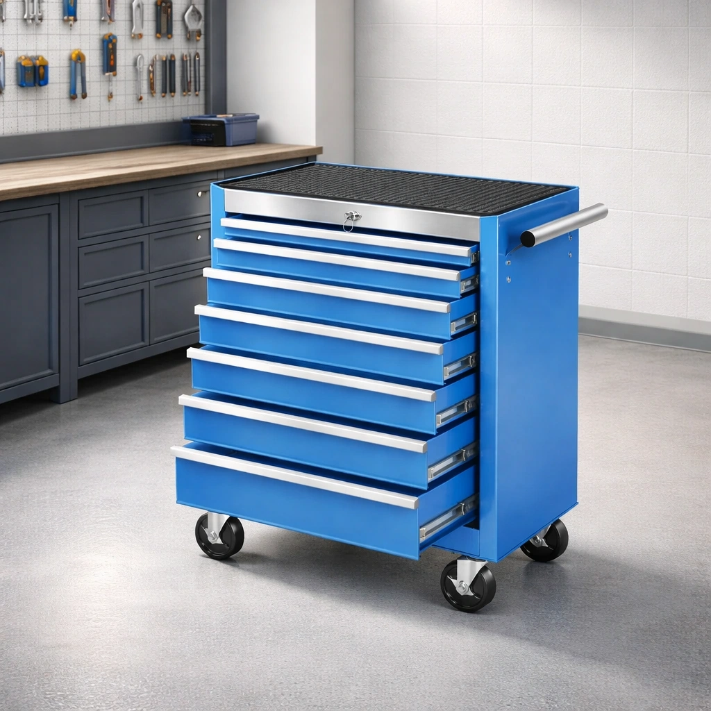 Carro de herramientas metálico con 7 cajones ruedas y cerradura azul